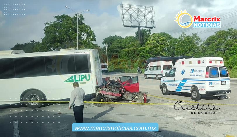 Playa del Carmen (Marcrix Noticias).— Al menos dos personas murieron esta mañana por el impacto de un automóvil particular contra la parte trasera de un autobús de transporte de personal.