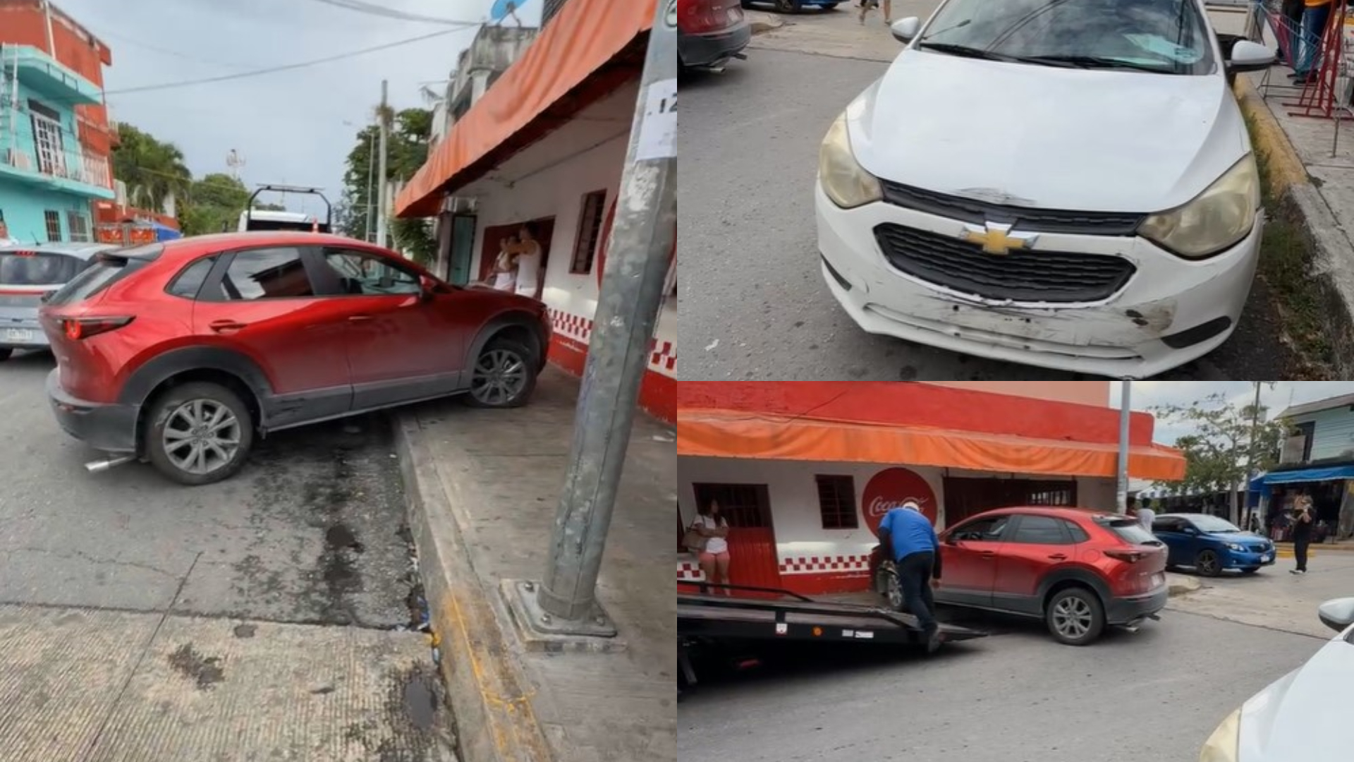 Tras el impacto, la conductora se puso nerviosa, aceleró y perdió el control del vehículo, montando la banqueta y golpeando la barra y parte frontal de un negocio de comida, quedando a escasos centímetros de introducirse por completo al establecimiento.