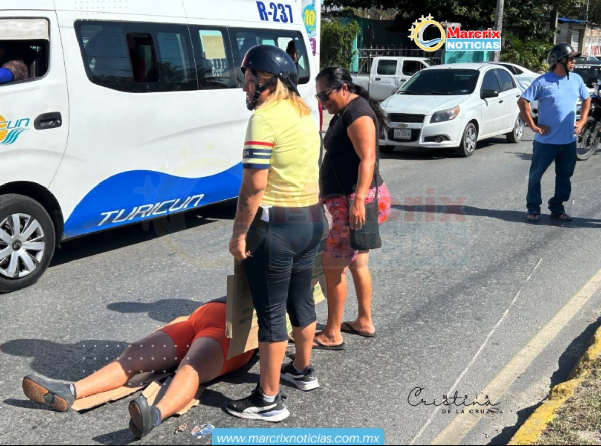 Cancún (Marcrix Noticias)Una mujer que circulaba en motocicleta por la avenida Diagonal Tulum, frente a la región 240 en la supermanzana 76 de Cancún, sufrió una aparatosa caída este viernes tras presuntamente ser rebasada peligrosamente por otro vehículo.