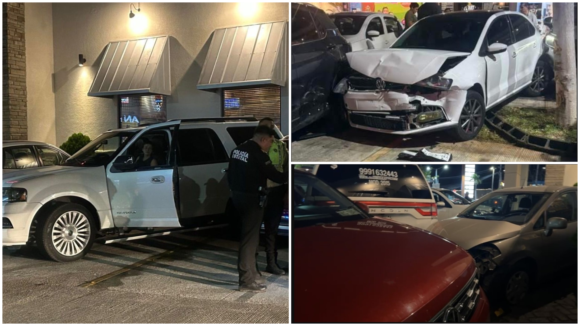 Ciudad Caucel (Marcrix Noticias).- Un accidente vehicular ocurrió en el estacionamiento del restaurante Texas Roadhouse, en Ciudad Caucel, Mérida, cuando una mujer al volante de una camioneta Lincoln Navigator, chocó contra al menos nueve vehículos.