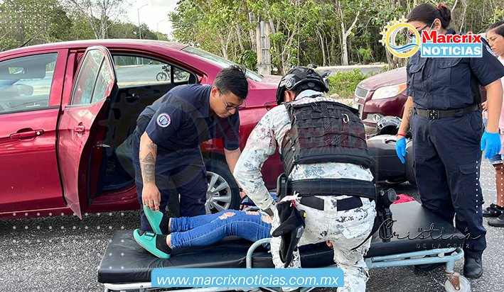 Cancún (Marcrix Noticias).- Una mujer colisionó a un automóvil color rojo en la zona del Periférico, por Vista del Mar en Cancún y terminó lesionándose.