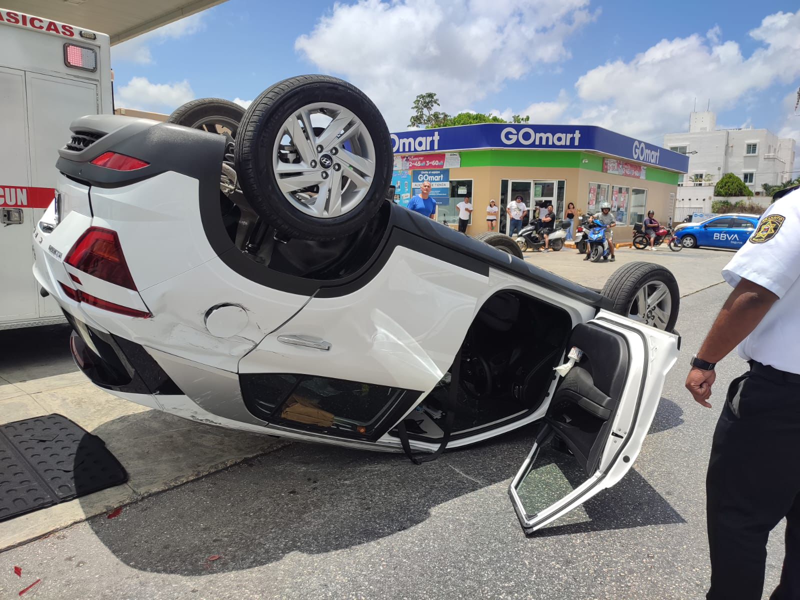 Fueron elementos de Seguridad Ciudadana quienes llegaron al lugar para atender este accidente vehicular, que según testigos fue provocado por el exceso de velocidad con el que la mujer conducía su automóvil tipo Hyundai Creta y querer ganar el paso para cargar gasolina.