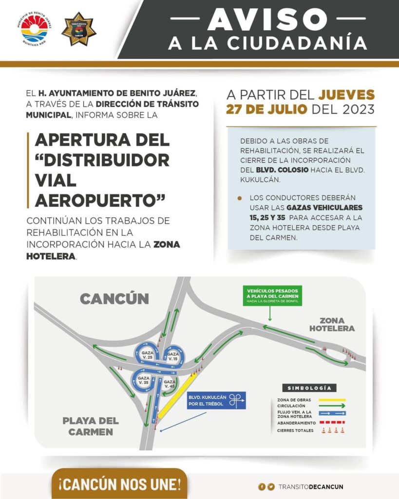 ➖Boulevard Colosio altura de la entrada al Boulevard Kukulkán se mantiene el cierre por trabajos de repavimentación en el lugar en dirección de Oriente a Poniente