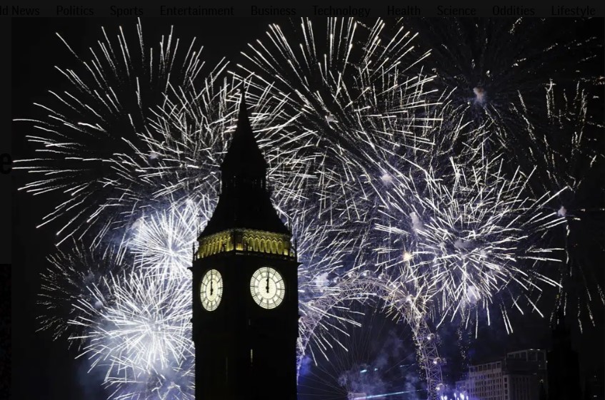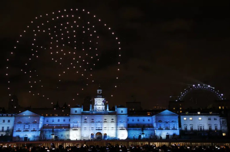 El Big Ben repicó mientras más de 100.000 personas se congregaban a orillas del Támesis para contemplar un espectáculo de fuegos artificiales en torno al Ojo de Londres. El espectáculo incluyó una corona formada por drones y el retrato de la reina Isabel II en una moneda flotando en el cielo, en homenaje a la monarca que mayor tiempo ha gobernado Gran Bretaña y que falleció en septiembre.