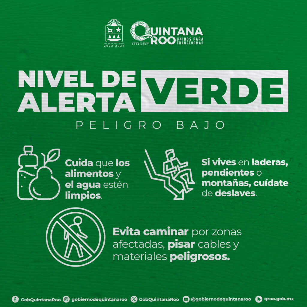 Mientras que Solidaridad, Tulum, Felipe Carrillo Puerto, Othón P. Blanco, José María Morelos y Bacalar han disminuido a Alerta Azul, que significa “peligro mínimo”.