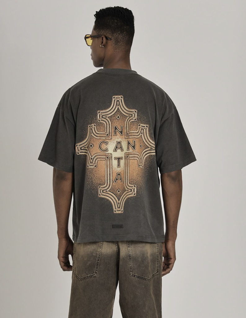 En las imágenes del primer lanzamiento o drop, se puede ver un pantalón de mezclilla de estilo ‘washed’ o deslavado, combinado con una playera negra que presenta un diseño sencillo pero impactante: una cruz con el nombre de la marca estampada en la parte de atrás.