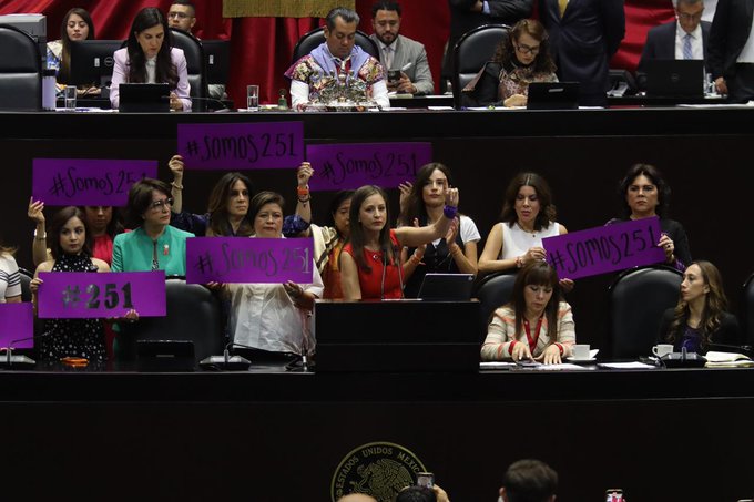 En la sesión ordinaria de la Cámara de Diputados este 25 de marzo, las diputadas llevaron carteles morados con la leyenda “Somos 251″, en referencia a que hay en este organismo 251 diputadas y, por ello, serían las mujeres las que tomarían la decisión de quitar el fuero o no a Blanco.