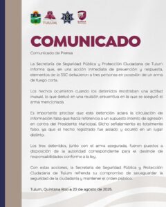 De acuerdo con el comunicado oficial, elementos de la Secretaría de Seguridad Pública y Protección Ciudadana de Tulum realizaron una revisión preventiva tras detectar a tres personas con “actitud inusual evasiva”, logrando asegurar un arma corta.