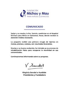 Ciudad de México. (Marcrix Noticias).- La menor de dos años Jazlyn Azulet, nieta de la conocida “abuelita heroína” de Iztapalapa, recibió su primera cirugía de injertos en manos, piernas y cabeza tras sufrir graves quemaduras en la explosión de una pipa de gas LP ocurrida en el Puente de La Concordia, en la alcaldía Iztapalapa, Ciudad de México. El procedimiento se realizó con éxito en el Shriners for Children Hospital en Galveston, Texas, donde la niña fue trasladada para recibir atención médica especializada.