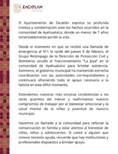 El ayuntamiento informó que se brindó asistencia a la familia, y a través de la Dirección de Protección Civil y Bomberos, se acudió al lugar de los hechos tras la llamada de emergencia.