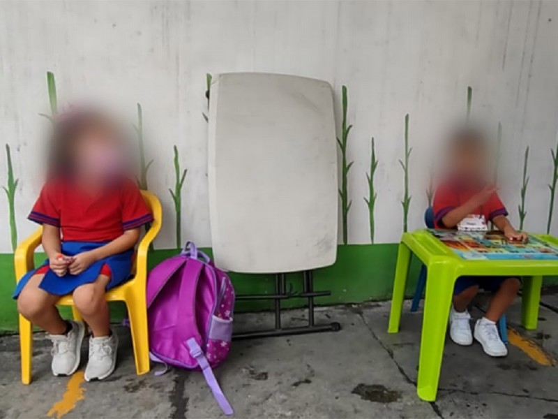 MONTERREY (MARCRIX NOTICIAS) Unos minutos antes de que el kinder Josefina Ramos del Río abra sus puertas, en Monterrey, Nuevo León, afuera sus pequeños estudiantes aguardan en la banqueta haciendo una inusual fila, sentados en sillitas plásticas de colores vivos y recargando sus antebrazos en mesitas portátiles.