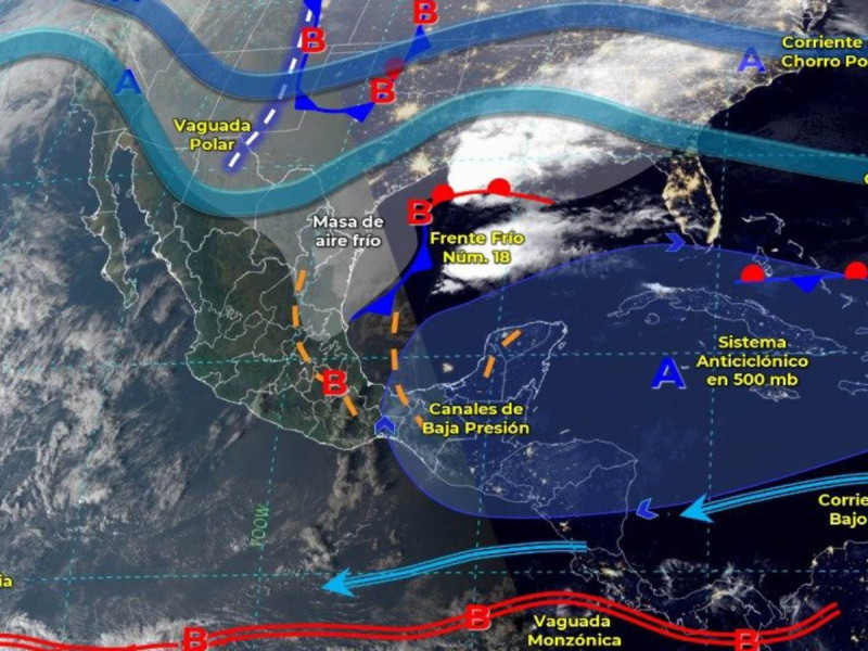El Frente Frío se desplazará sobre el noreste, oriente y sureste del país, ocasionando chubascos con lluvias fuertes.