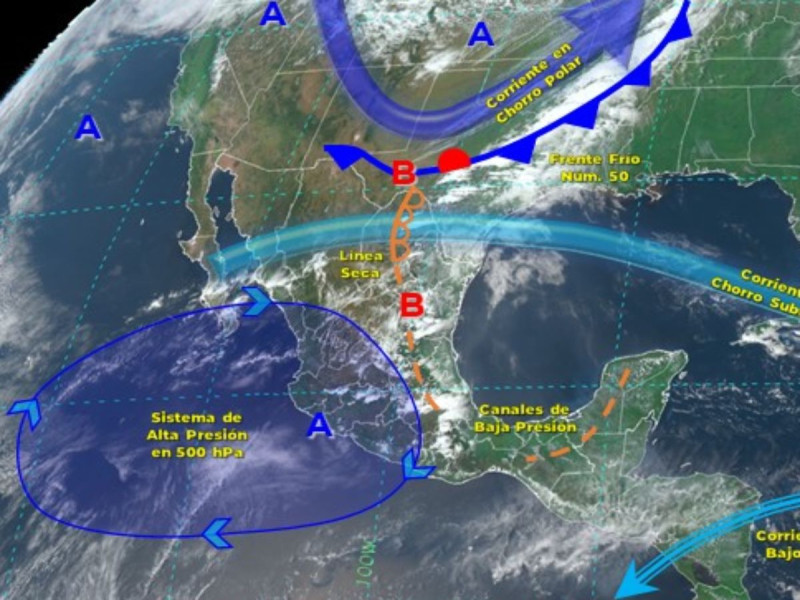 El frente frío 50 se extenderá sobre el norte y noreste de la República Mexicana, en interacción con un canal de baja presión que se localizará sobre el oriente y centro del territorio nacional, y con la corriente en chorro subtropical, originarán lluvias fuertes acompañadas de descargas eléctricas, rachas de viento y posible caída de granizo.