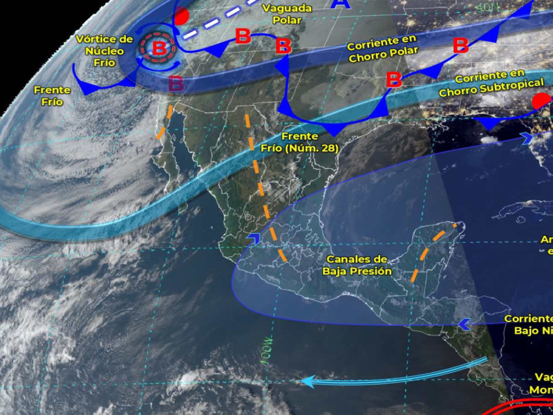 De acuerdo con el comunicado del organismo dependiente de la Comisión Nacional del Agua (Conagua), otro frente frío se extenderá cerca de la frontera noroeste del país donde interaccionará con un vórtice de núcleo frío y con la entrada de humedad producida por las corrientes en chorro polar y subtropical, generando vientos fuertes con tolvaneras, chubascos y lluvias fuertes sobre la Península de Baja California, Sonora, Chihuahua, Sinaloa y Durango.