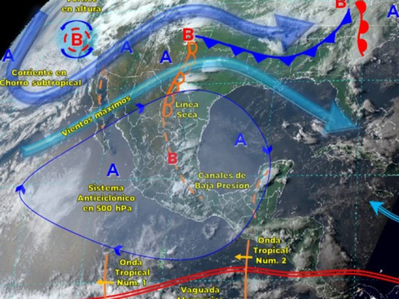 De acuerdo con el comunicado del organismo dependiente de la Comisión Nacional del Agua (Conagua), una línea seca sobre el norte de México, la corriente en chorro subtropical, dos canales de baja presión uno extendido sobre el centro y sur del país, y otro sobre el sureste y la Península de Yucatán, en interacción con la onda tropical número 2 al sur de las costas de Guerrero, ocasionarán lluvias y chubascos, así como vientos fuertes con posibles tolvaneras.