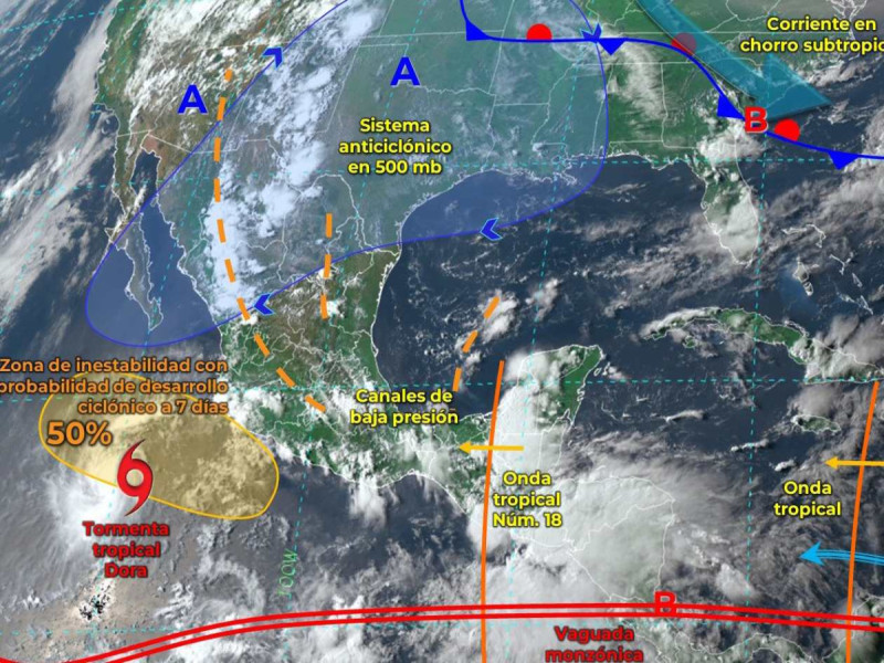 A su vez, el monzón mexicano prevalecerá sobre el noroeste, mientras que un canal de baja presión se extenderá sobre el occidente y centro del país, provocando lluvias fuertes a muy fuertes acompañadas de descargas eléctricas, rachas de viento y posibles granizadas.