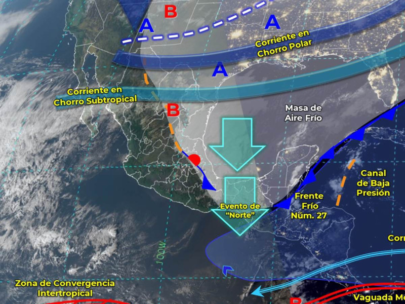 El frente frío 27 prevalecerá con características de estacionario sobre la Península de Yucatán y el sureste del país, en interacción con un canal de baja presión que se ubicará sobre el occidente del Golfo de México, ocasionará lluvias muy fuertes en Veracruz, Oaxaca, Chiapas, Tabasco y Quintana Roo, además de lluvias fuertes en Campeche y Yucatán.
