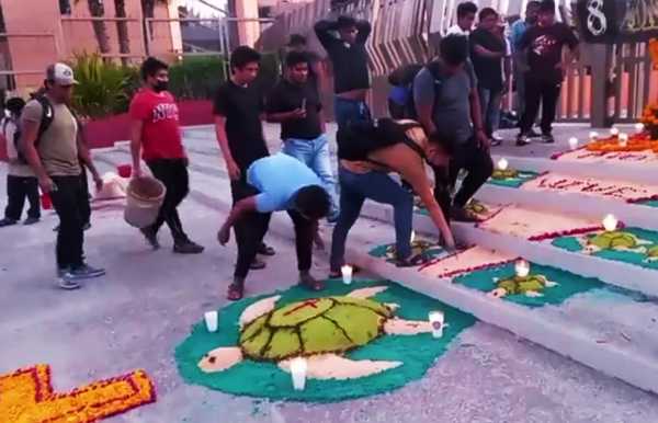 Sobre una manta que encabeza la ofrenda, los normalistas escribieron: “Porque vivos se los llevaron, vivos los queremos +43, 8 años sin justicia“; además con aserrín colorido en verde, formaron las imágenes de tortugas que sobre su caparazón soportaban veladoras, aludiendo a las almas de sus compañeros asesinados en los últimos 10 años.