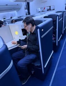 El senador con licencia de Morena fue visto en un exclusivo lounge, durante su escala en Emiratos Árabes, mientras continúa su gira internacional.