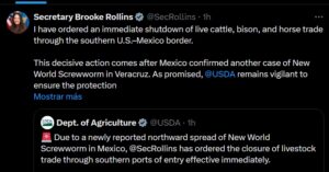 Washington (Marcrix Noticias).— La Secretaria de Agricultura de Estados Unidos, Brooke Rollins, ordenó el cierre inmediato de la frontera con México para el comercio de ganado vivo, bisontes y caballos, tras confirmarse otro caso de gusano barrenador en Veracruz.