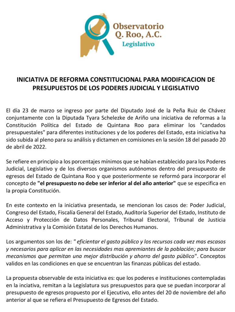 Destaca que es una iniciativa de reformas a la Constitución Política del Estado de Quintana Roo para eliminar los “candados presupuestales” para diferentes instituciones y de los poderes del Estado, esta iniciativa ha sido subida al pleno para su análisis y dictamen en comisiones en la sesión 18 del pasado 20 de abril de 2022.