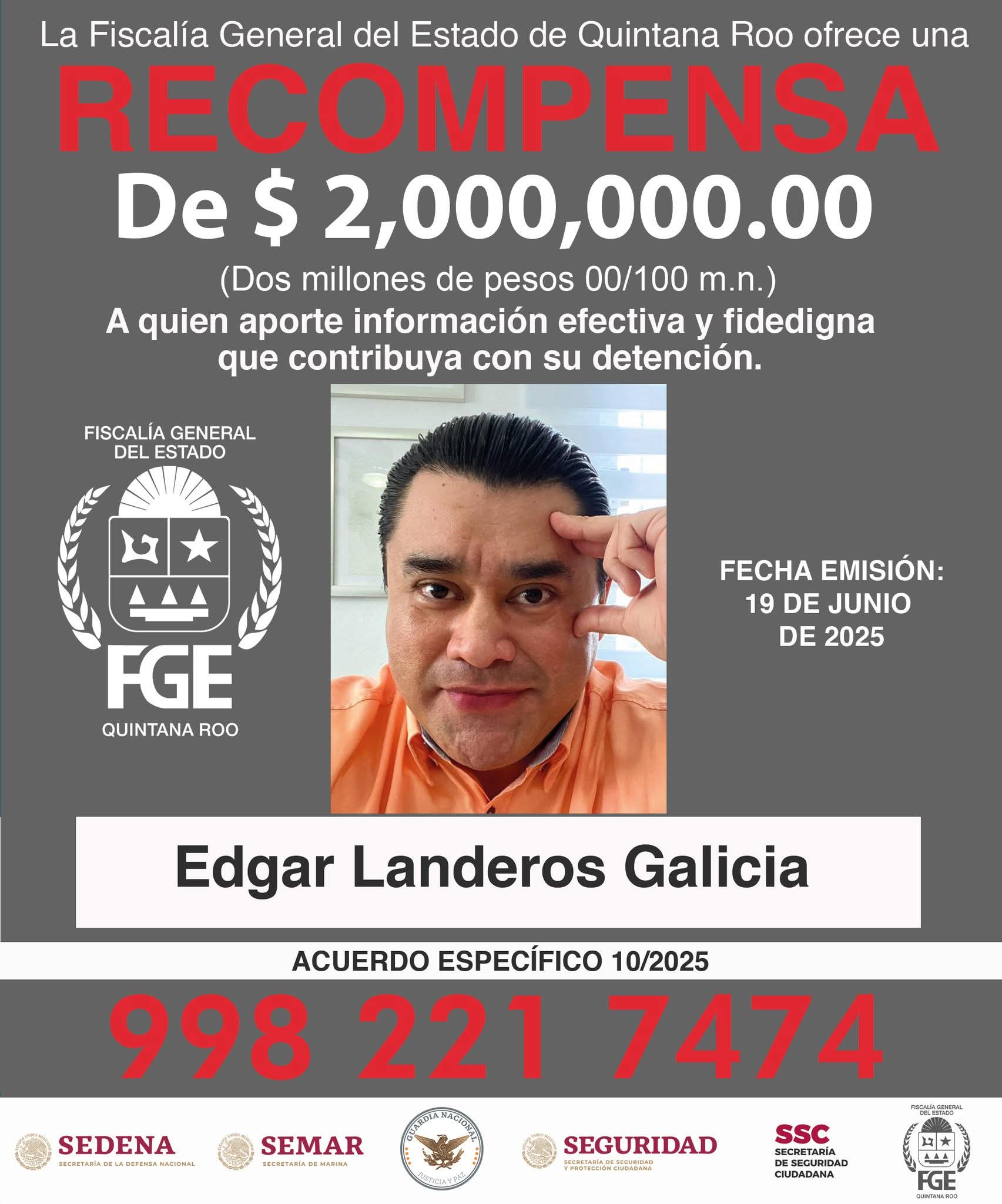 Cancún(Marcrix Noticias).- La Fiscalía General del Estado (FGE) de Quintana Roo ofrece una recompensa de dos millones de pesos a quien proporcione información veraz y útil que permita la localización y captura de Edgar Landeros Galicia, médico psiquiatra acusado de abuso sexual en contra de una paciente en Cancún.