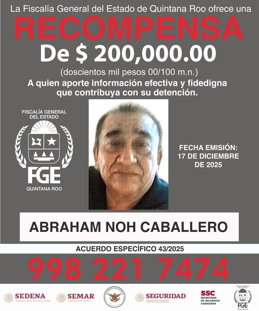 Cancún (Marcrix Noticias)-La Fiscalía General del Estado (FGE) anunció la emisión de una recompensa de 200 mil pesos como parte de las acciones para lograr la localización y detención de Abraham Noh Caballero, quien cuenta con una orden de aprehensión vigente emitida por autoridades estatales.