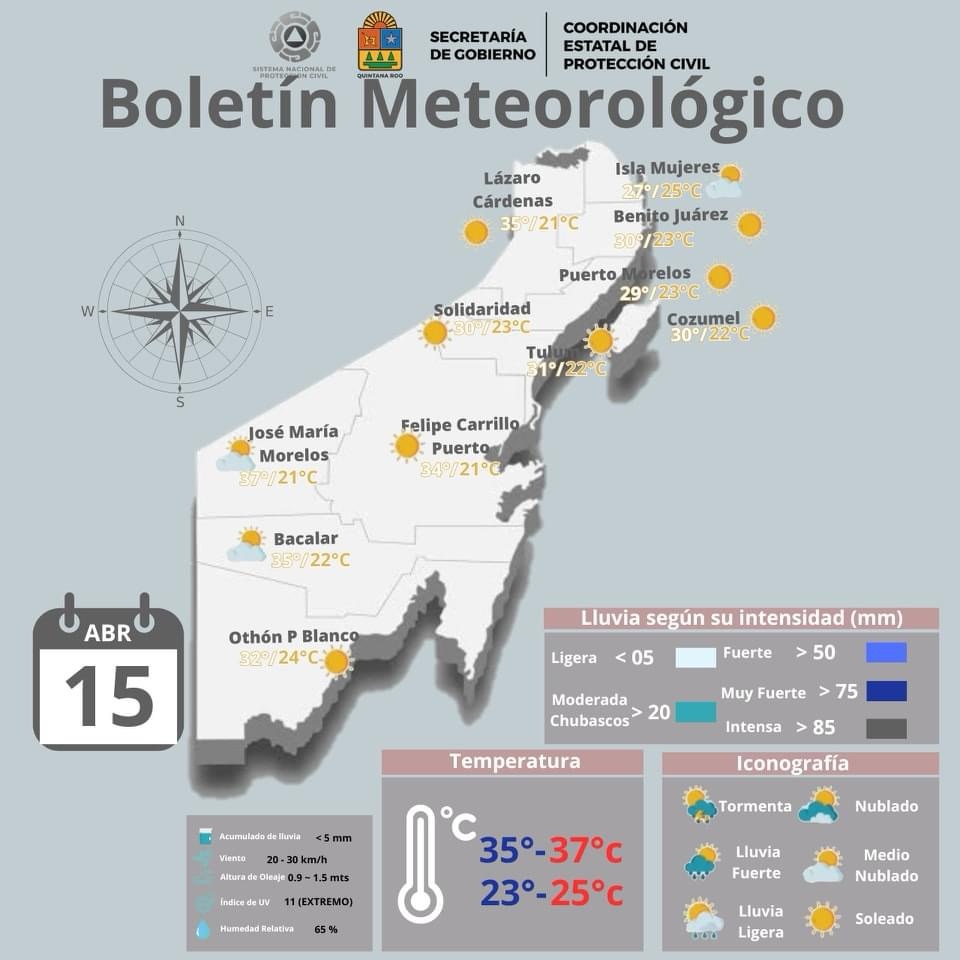 Chetumal (Marcrix Noticias)-Una circulación anticiclónica localizada en niveles medios de la atmósfera, mantendrá durante este día Lunes la primera onda de calor sobre el Estado de Quintana Roo con temperaturas máximas diurnas entre 35 y 40 GC, cielo parcialmente nublado con incremento de nublados durante el día, poca probabilidad de lluvias sobre el Estado, ambiente muy caluroso a bochornoso durante el día y cálido durante la madrugada y el amanecer.