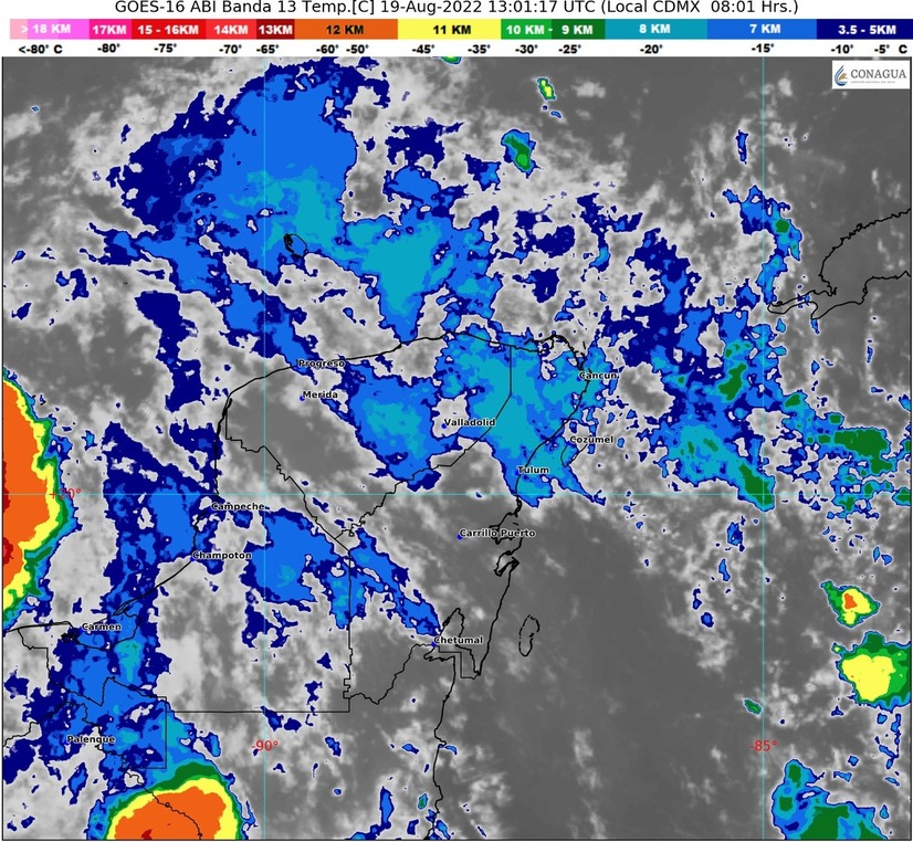 1.- Continúa la entrada de aire marítimo tropical con variable contenido de humedad procedente del Golfo de México y mar Caribe hacia la región peninsular; provoca la permanencia de temperaturas muy calurosas durante el día y parte de la noche, cielo medio nublado a nublado; se registrarán lluvias con chubascos dispersos acompañados de actividad eléctrica aislada sobre la mayor parte del Estado de Quintana Roo, durante el día y parte de la noche.