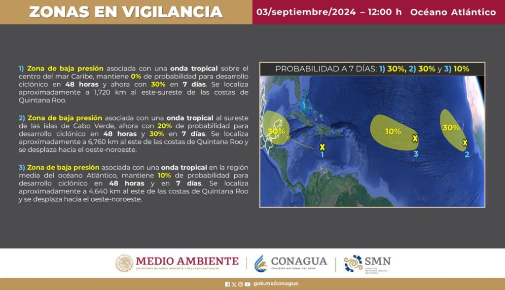 Por el momento el pronóstico apunta a que el sistema se estacionará sobre la Península de Yucatán, provocando lluvias todo el fin de semana, prolongándose de forma intermitente por lo menos hasta el martes 10 de septiembre.