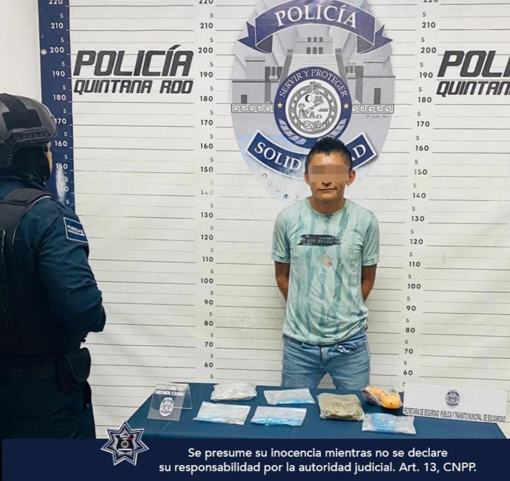 En tanto, sobre la calle cerrada Cazón de ese mismo fraccionamiento, fue asegurado Fredy “N” de 37 años, procedente de Yucatán, tras ser sorprendido manipulando varios envoltorios que resultaron ser siete con posible marihuana, siete con lo que parece la droga llamada cristal, 26 con polvo blanco al parecer cocaína y seis con posible narcótico llamado piedra.