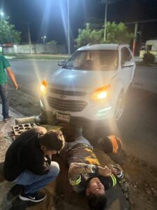 Chetumal (Marcrix Noticias)-  La madrugada de domingo, se registró un fuerte accidente en donde un motociclista casi pierde la vida al quedar bajo una camioneta.