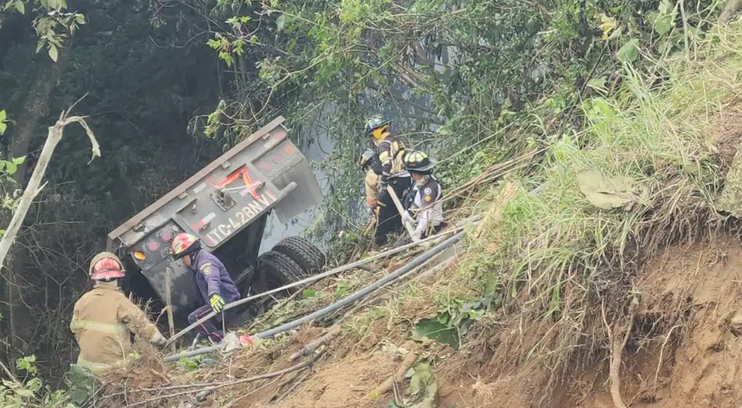 El segundo accidente se registró en el kilómetro 32 de la ruta Interamericana, en dirección hacia Chimaltenango, cuando el tráiler impactó contra un muro perimetral y una baranda de contención, lo que provocó que se precipitara al fondo de un barranco y se incendiara tras el impacto.
