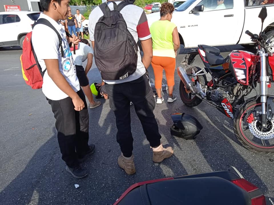 Cancún (Marcrix Noticias).- Un aparatoso accidente se registró este sábado en la avenida 135 de Cancún, donde una pareja de motociclistas quedó lesionada.