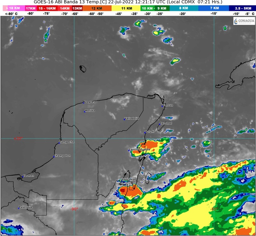 1.- Entrada de aire marítimo tropical con variable contenido de humedad del Golfo de México y mar Caribe hacia la Península de Yucatán; favorece la permanencia de temperaturas muy calurosas a bochornosas durante el día y parte de la noche, cielo medio nublado; se registrarán lluvias aisladas con chubascos ocasionales sobre algunas zonas del Estado de Quintana Roo, más frecuentes por la tarde o noche.