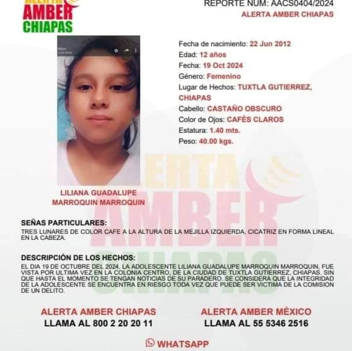 Chipas (Marcrix Noticias)- La mañana del 19 de Octubre, la niña Liliana Guadalupe Marroquín Marroquín, de tan solo 12 años de edad oriunda de Berriozábal, Chiapas, de oficio vendedora ambulante de chicharrones y dulces, desapareció sin dejar rastro cuando vendía su mercancía en Tuxtla Gutiérrez.