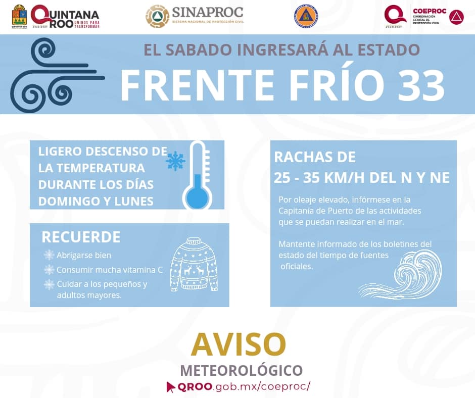 Cancún (Marcrix Noticias).- El frente frío número 33 se extenderá sobre el sureste mexicano y la Península de Yucatán, producirá lluvias puntuales torrenciales en zonas de Chiapas y Tabasco, así como intensas en Veracruz y Oaxaca.
