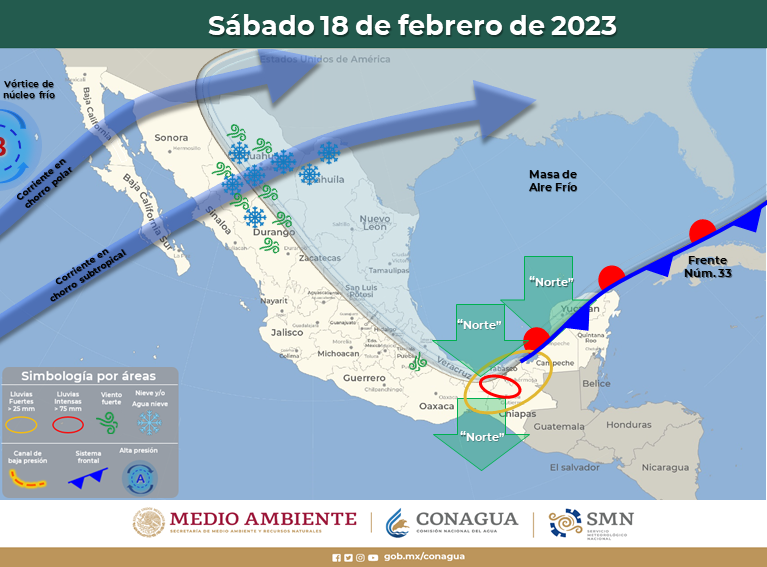 La masa de aire frío asociada al sistema frontal, ocasionará ambiente frío a muy frío, con heladas durante la madrugada del sábado sobre entidades del noroeste, norte, noreste, centro y oriente de la República Mexicana, bancos de niebla en la Sierra Madre Oriental, así como evento de “Norte” muy fuerte a intenso en el litoral de Veracruz e Istmo y Golfo de Tehuantepec; fuerte en el litoral de Tamaulipas, Tabasco y la Península de Yucatán.