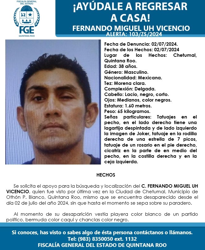 Se trata de Fernando Miguel Uh Vicencio, de 38 años y con su caso ya son 103 desaparecidos en el Sur de Quintana Roo, reportó la Vicefiscalía de Justicia Distrito Sur, tan solo en este año 2024.