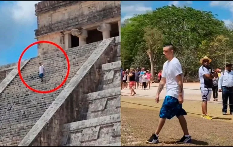 En un video compartido en Twitter es posible observar que un hombre con playera blanca y short azul se encuentra en la cúspide de la pirámide de Chichen Itzá, también conocida como Pirámide de Kukulcán o El Castillo.