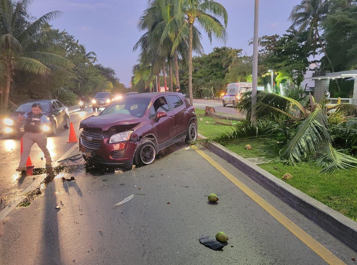 Según el reporte de Tránsito, el conductor de la Trax, color rojo, marca Chevrolet circulaba por el Km 3.5 de bulevar Kukulcán, en dirección de poniente a oriente, y al no tener en cuenta las condiciones de la vía de circulación y las del propio conductor, pierde el control de su dirección hacia la izquierda subiéndose al camellón central siguiendo su trayectoria hasta chocar contra un objeto fijo (palmera), derrabándola de su base y terminar en la vía de circulación, siendo esta su posición final.