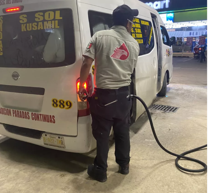 Los usuarios del transporte público compartieron imágenes en redes sociales, en las que se observa la van con número económico 889, detenida en la bomba de gasolina mientras el conductor solicitaba al despachador llenar el tanque sin apagar el motor.