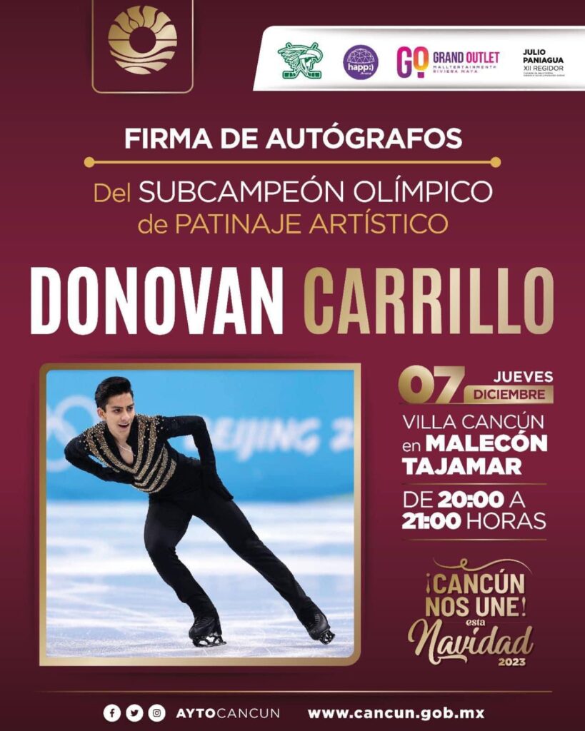 Cancún(Marcrix Noticias).- El Ayuntamiento de Benito Juárez dio a conocer la firma de autógrafos del Subcampeón de patinaje artístico, Donovan Carrillo, quien estará en la Villa Cancún en el Malecón Tajamar de Cancún el jueves 7 de diciembre de 20 a 21 horas.