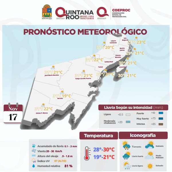 8.- FELIPE CARRILLO PUERTO.- medio nublado, poca probabilidad de lluvias, caluroso, viento del oeste y noroeste de 20 a 30 km/h con rachas más fuertes. Temperatura Máxima: 28/30 GC. Temperatura Mínima: 20/22 GC. Sensación Térmica: 37 GC. Presión Atmosférica: 1011 hPa. Salida del Sol: 07:03 h. Puesta del Sol: 18:14 h.