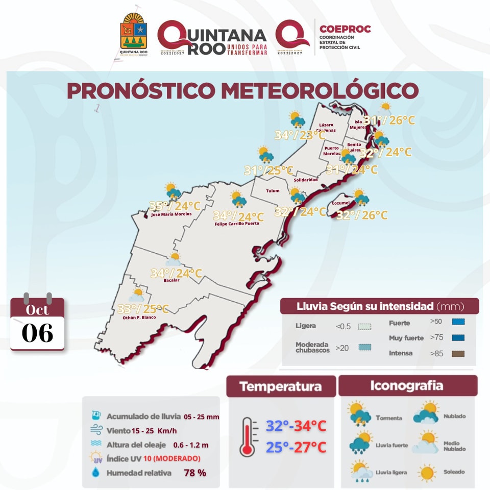 Este fenómeno originará cielo parcialmente nublado con incremento de nublados durante el transcurso del día, lluvias con intervalos de chubascos dispersos acompañados de actividad eléctrica sobre algunas zonas del Estado de Quintana Roo.
