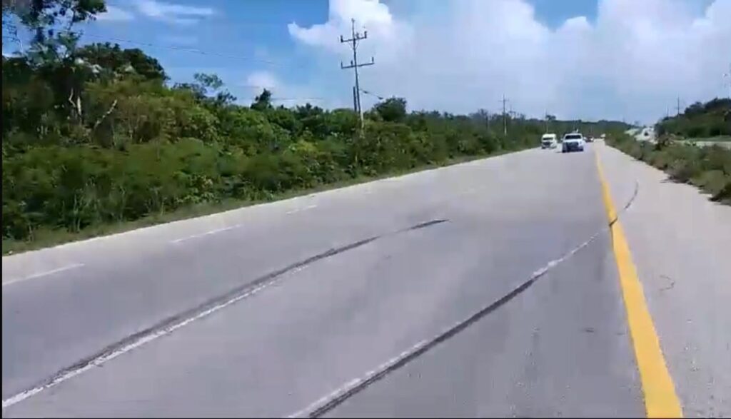 En los videos puede observarse que sobre la carretera hay un derrapón de llantas, “todos los compañeros asustados, sí, pero bendito Dios el chofer supo maniobrar”, y agregó un mensaje para Mara Lezama, “gobernadora aquí estamos y estamos bien”.
