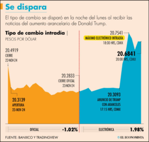 El aumento en la cotización del dólar se debió a la amenaza de Trump de imponer un arancel del 25% sobre los productos importados de México, China y Canadá, una medida que podría tener efectos devastadores en la economía mexicana.