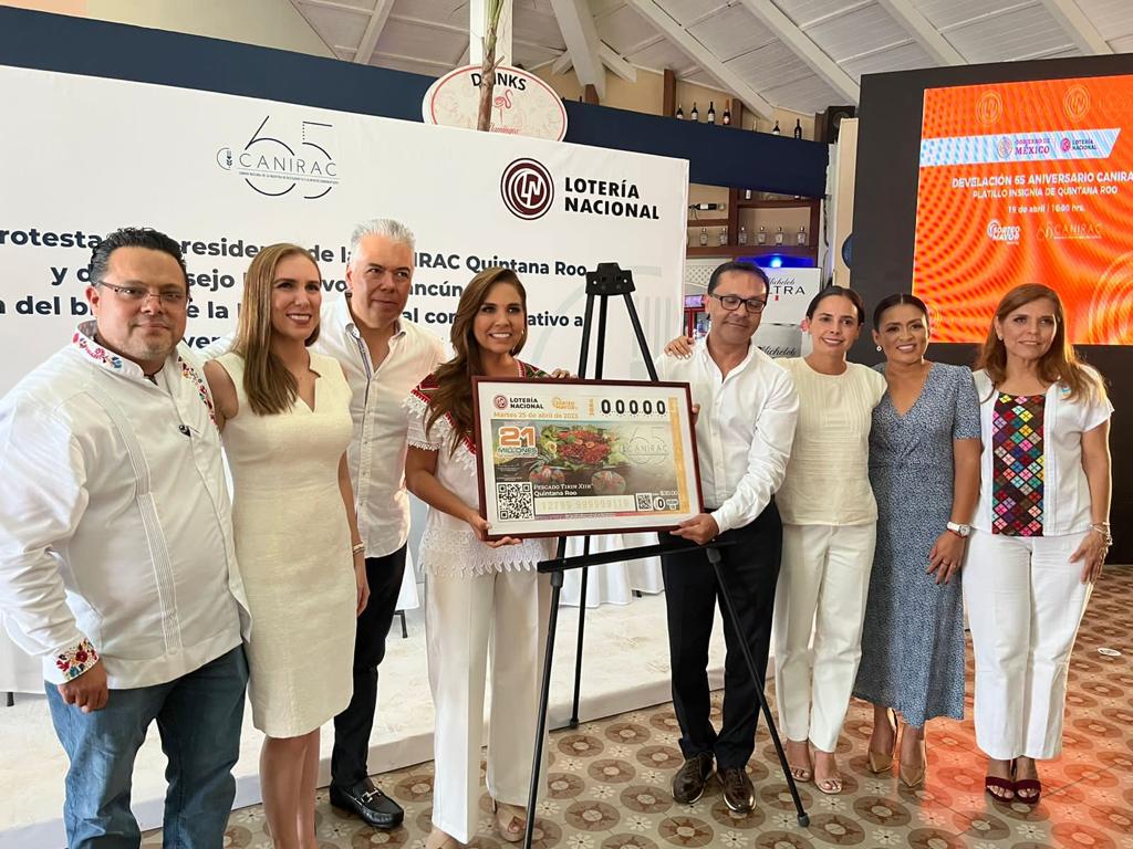 En este marco, se llevó a cabo también la develación del billete de lotería conmemorativo de la gastronomía del Caribe Mexicano, representada por el pescado Tikinxic, como parte de la emisión especial de los 32 estados alusiva a los festejos del 65º aniversario de la Canirac a nivel nacional, la cual estuvo a cargo de la gobernadora Mara Lezama, el gerente de Nuevos Productos de Lotería Nacional, David Jacinto Rodríguez, y Villarreal Zapata, entre otros invitados.