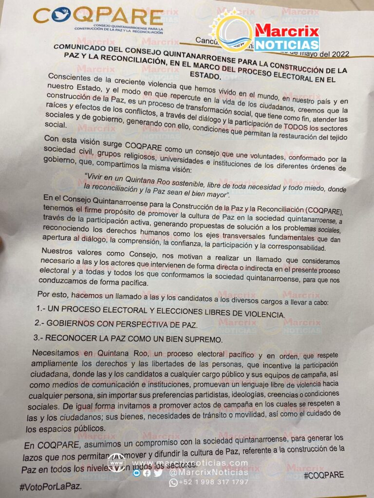 Cancún (Marcrix Noticias).- El Consejo Quintanarroense para la Construcción de la Paz y la Reconciliación (COQPARE), hizo un llamado este martes a los candidatos a la gubernatura del estado y a diputados locales a no incurrir en violencia en las próximas elecciones del 5 de junio.