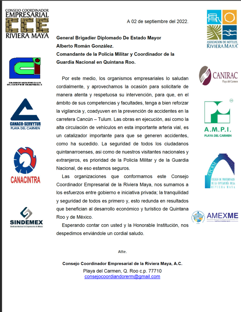 A través de un comunicado, los organismos empresariales piden al General Brigadier Diplomado De Estado Mayor Alberto Román González, comandante de la Policía Militar y Coordinador de la Guardia Nacional en Quintana Roo. Reforzar la vigilancia y, coadyuven en la prevención de accidentes en la carretera Cancún-Tulum.